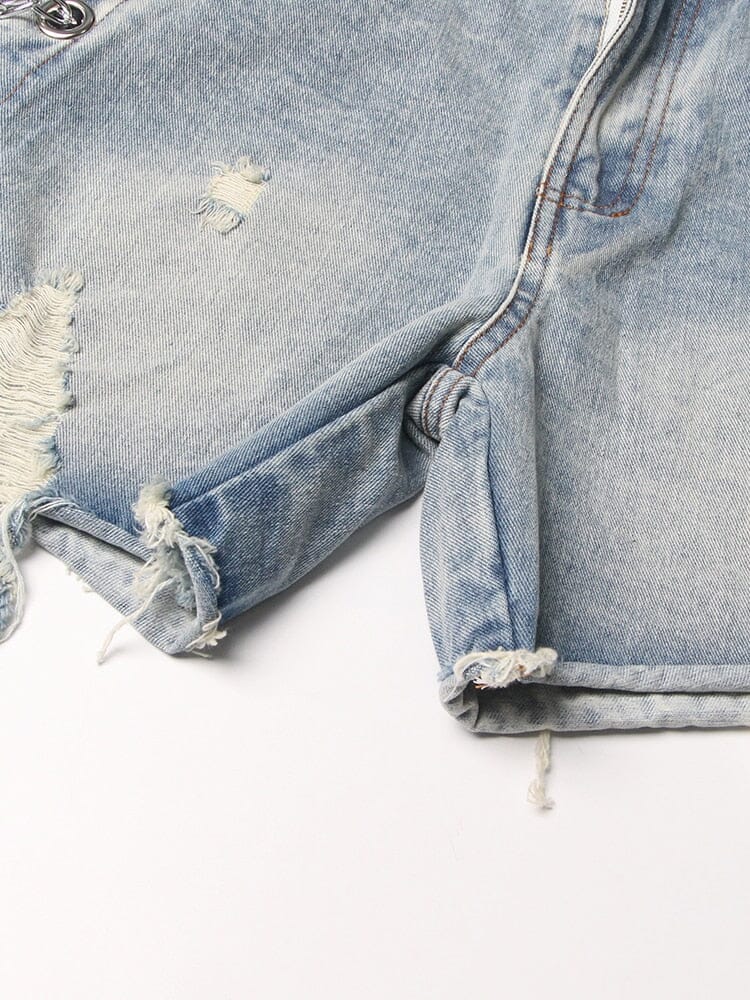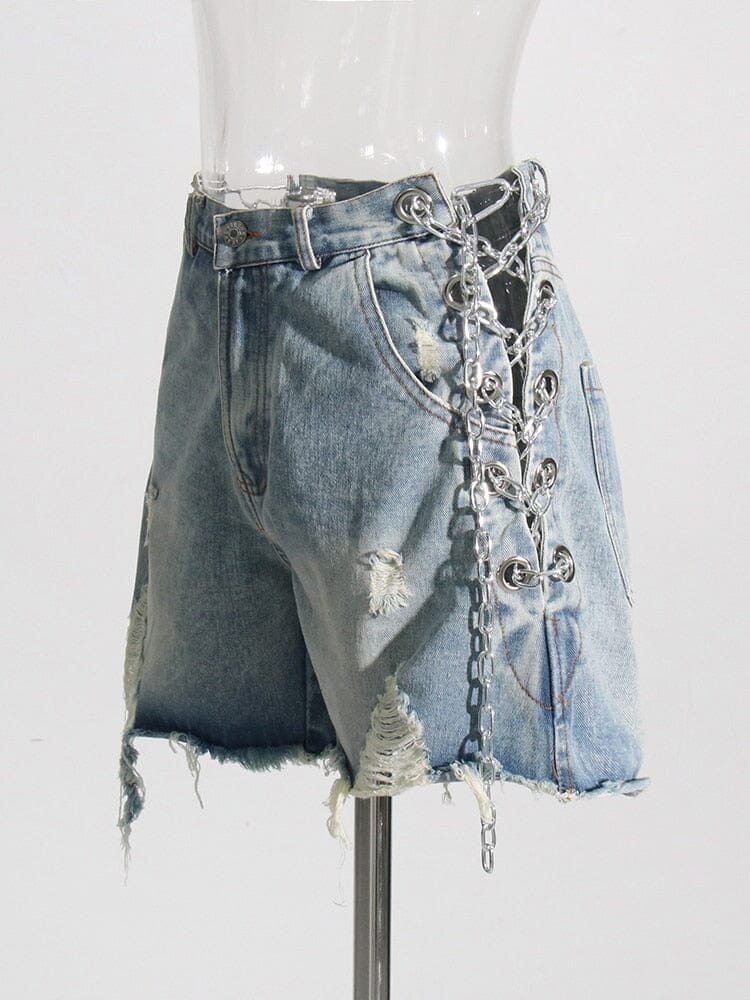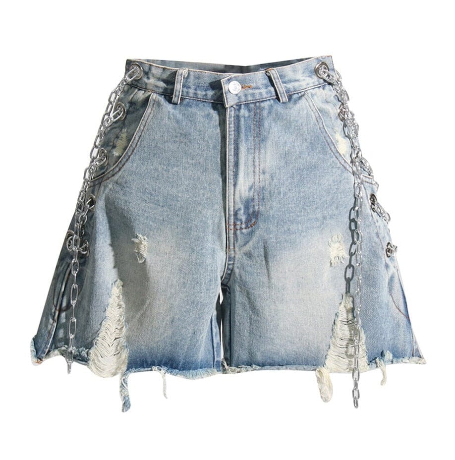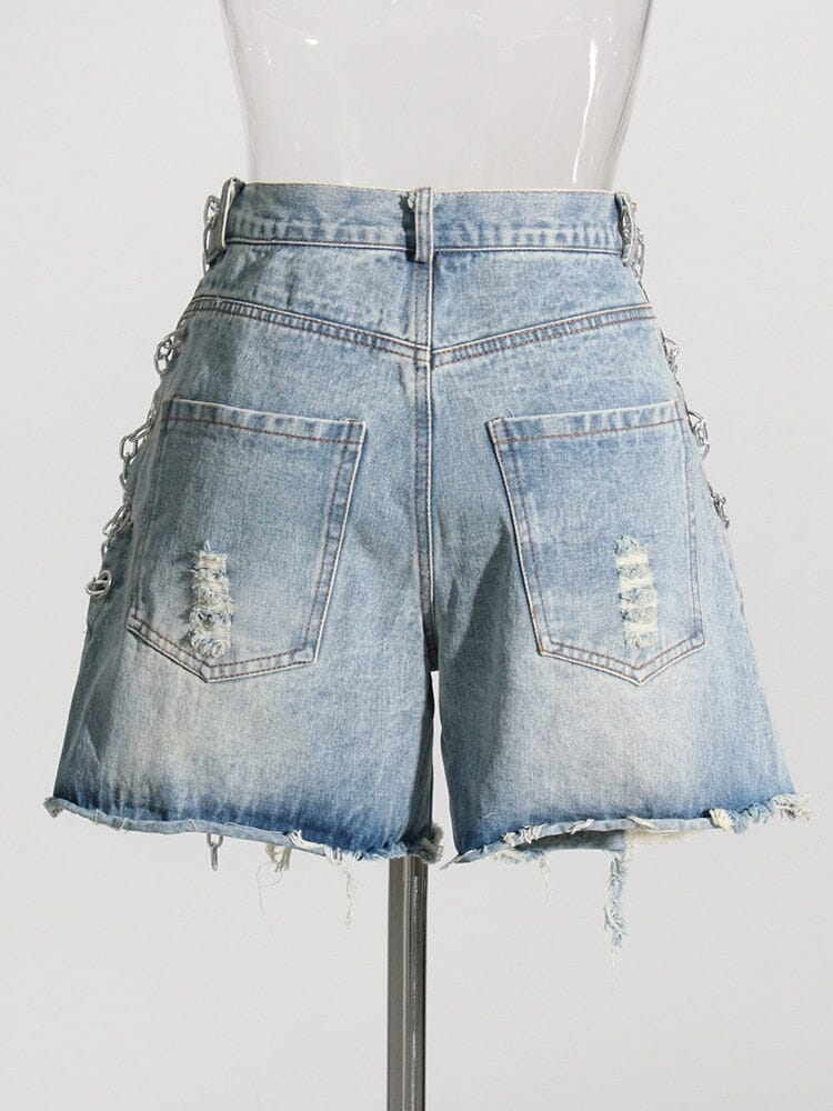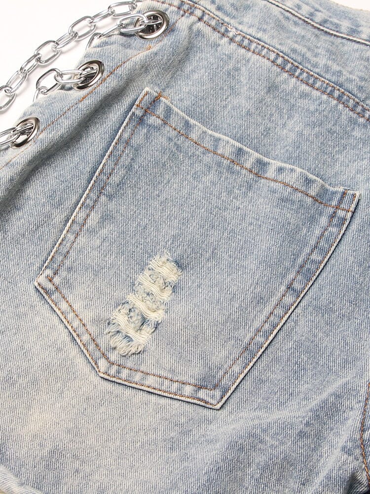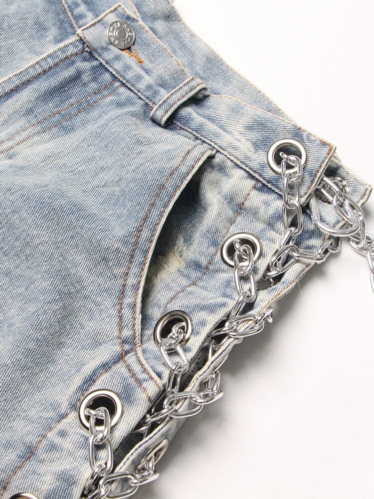 Featuring a premium, polyester-cotton fabric blend, high-wasted construction, distressed styling and hollowed out design with chain link accents to complete a look you won t find anywhere else. Exclusively for the confident.